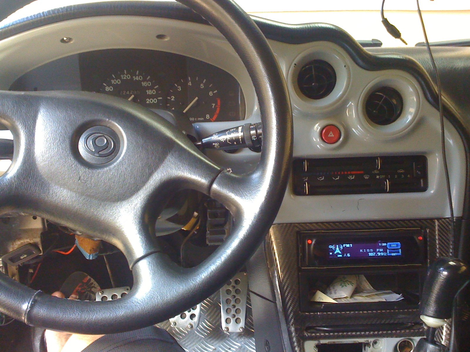 No local onde encaixa o corpo do radio voce deve cortar a cinta traseira de plastico pois o equipamento é 2 cm maior que os convencionais. minha solução foi eliminar a cinta plastica e montar uma com fita metalica na medida correta.